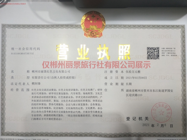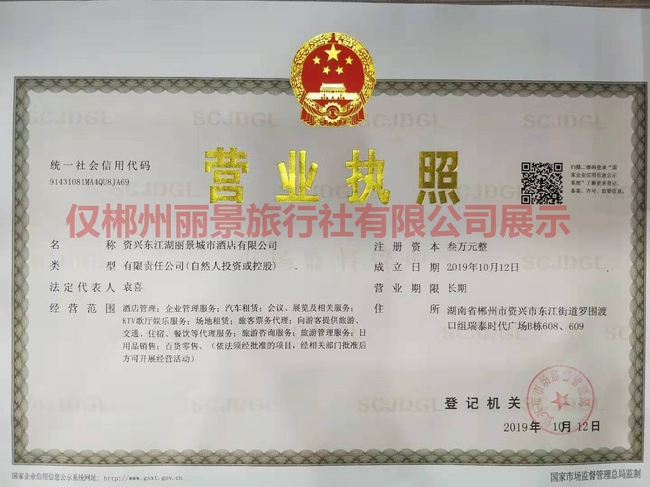 為彰顯誠(chéng)信旅游環(huán)境,讓廣大客戶放心選擇我們,郴州麗景旅行社有限公司公開展示旗下旅游產(chǎn)業(yè)工商信息。用我們的產(chǎn)品讓您的生活更美好!