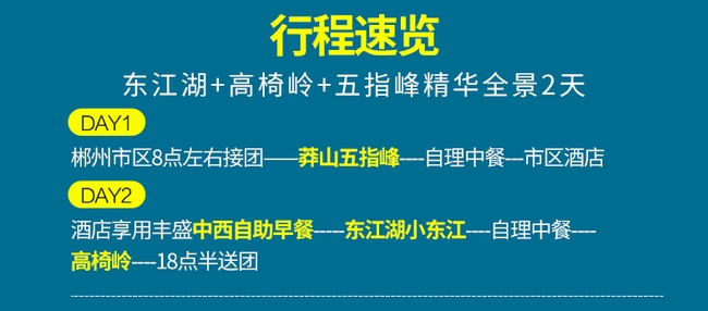 門票:莽山五指峰門票+景區(qū)環(huán)保車+纜車+東江湖線路一門票+車費