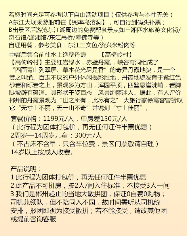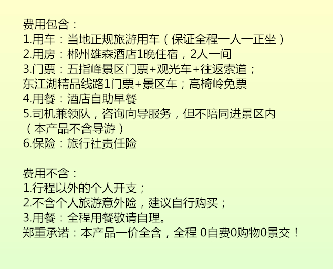 DAY1:郴州市區(qū)接團(tuán)一莽山·五指峰景區(qū)一入住郴州雄森酒店8點(diǎn)左右郴州市區(qū)(具體時(shí)間地點(diǎn)以出發(fā)前一天工作人員通知為準(zhǔn))接貴客前往【莽山·五指峰景區(qū)】,由中景信集團(tuán)的歷數(shù)三年,巨資投入、超前規(guī)劃、人性設(shè)計(jì)、精工建設(shè)及匠心打造,南中國(guó)最長(zhǎng)懸空棧道:總長(zhǎng)約8公里,海拔1400米至1600米,兩層棧道,全程無(wú)障礙觀光環(huán)線,登高山、臨絕壁如履平地,盡享“非人”奇遇。乘坐中國(guó)目前最長(zhǎng)索道單線的觀光纜車;游玩時(shí)間約5小時(shí)。中餐晚餐自理,晚上入住郴州雄森國(guó)際假日酒店。第二天:霧漫小東江一龍景峽谷一高椅嶺--郴州送團(tuán)早上6點(diǎn)半左右酒店接團(tuán)前往【霧漫小東江】,偉大的思想家孔子曾經(jīng)說(shuō)過(guò)“仁者樂(lè)山,智者樂(lè)水”而東江湖正是有山有水它集江南名山秀水的旖旎風(fēng)光于一體,自然景觀與人文景觀交相輝映。景區(qū)面積200平方公里,160平方公里的湖面煙波浩淼平均水深51米,最深處達(dá)157米,蓄水量達(dá)81.2億立方米的湖水 晶瑩透澈,被譽(yù)為“湘南洞庭”,數(shù)十個(gè)島嶼星羅 其中,被稱為“東方瑞士“溫馨提示:霧漫小東江屬于溫差產(chǎn)生的自然景觀,可遇不可求哦!景區(qū)有安排漁夫撒網(wǎng)表演哦。觀霧后沿小東江觀霧棧道往上游走到3號(hào)或者4號(hào)站臺(tái),繼續(xù)乘坐景區(qū)環(huán)保車前往終點(diǎn)站一東江大壩旅游碼頭。抵達(dá)大壩后可前往【龍景峽谷瀑布群】(參考時(shí)間約1.5小時(shí))龍景峽谷全線游程2.5公里??瓷阶钌絼?shì)陡峭,青山滴翠,古木參天;觀水景,一條清澈的溪流在峽谷中穿行,瀑布成群。沿途可以觀賞到煙竹山瀑布、龍景瀑、龍吟瀑、三疊瀑、龍卷瀑、鴛鴦瀑等形態(tài)各異的瀑布和古松坳、連理樹、龍鱗石等千姿百態(tài)的景點(diǎn)。