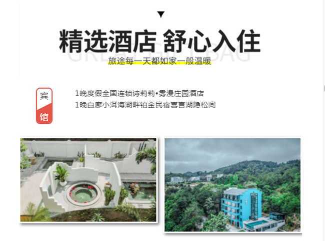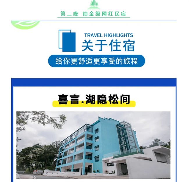 早晨酒店早餐后前往【東江湖景區(qū)】可參觀中華奇觀霧漫小東江,小東江水質(zhì)清澈明凈各項(xiàng)指標(biāo)均達(dá)到了國家一級飲用水標(biāo)準(zhǔn)。每年3-11月,每當(dāng)旭日東升或夕陽西下,整個(gè)小東江云蒸霞蔚,朦朧縹紗,仿佛進(jìn)入仙境。之后乘車前往--東江大壩旅游碼頭。東江湖湖面面積160平方公里,湖面煙波浩淼,平均水深51米,深處達(dá)157米,蓄水量高達(dá)81.2億立方米,相當(dāng)?shù)挠诎雮€(gè)洞庭湖大,因此被譽(yù)為“湘南洞庭”,數(shù)十個(gè)島嶼星羅其中,被稱為“東方瑞士”之后參觀【龍景峽谷景區(qū)】,峽谷內(nèi)有堪稱南國的瀑布群--龍景十八瀑:是國內(nèi)天然氧吧!是我國目前瀑布密集最高的景區(qū),有大小瀑布26處,水潭18個(gè),是國內(nèi)罕見的高負(fù)離子區(qū)。中午自理中餐后前往前往江湖【白廊小洱海最美環(huán)湖公路】,沿途參觀南國生態(tài)休閑漁村,吉尼斯世界大魚鍋。東江湖環(huán)湖路共長14公里是以湖光山色為主的觀景棧道,比千島湖安靜質(zhì)樸堪比美國66號公路,之后乘游船暢游大東江--登【東江湖鳳凰島】位于東江湖西北部,位于東江湖白廊片區(qū)湖的中央,是東江湖能在島頂360度觀湖景的地方。鳳凰島以“動物天堂、人的天堂"為主題,羊駝、孔雀、王松鼠、大嘴鳥、獼猴、珍珠雞、火雞等諸多可愛的動物自然放養(yǎng)其中。在這里你會有各色驚奇發(fā)現(xiàn),可愛的動物隨時(shí)與你不期而遇。特別贈送東江湖最火的【網(wǎng)紅打卡基地】。網(wǎng)紅攝影基地 Get網(wǎng)紅拍照地點(diǎn),輕松稱霸朋友圈讓你享受不用排隊(duì)慢慢拍的自由。晚上晚餐自理,入住鉑金民宿喜言湖隱松間(注鉑金級為民宿最高等級)