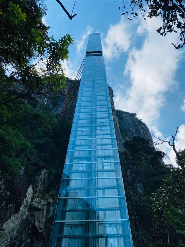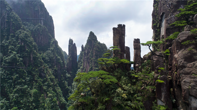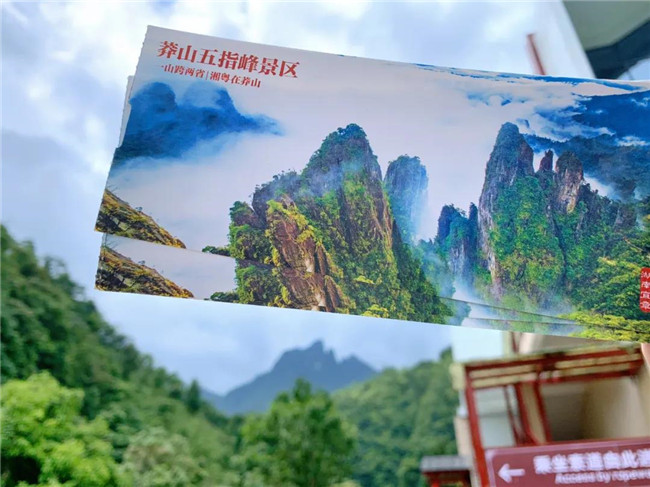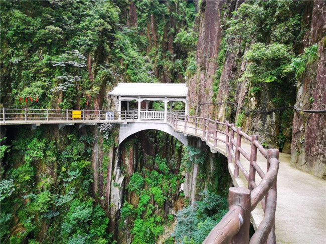 東進(jìn)東出:索道五指峰站→乘坐索道→索道天臺寺站→棧道中線→峽谷餐廳→摩天嶺電梯→棧道上線→小天臺→天臺寺→天臺小徑→棧道中線→索道天臺寺站→乘坐索道→索道五指峰站