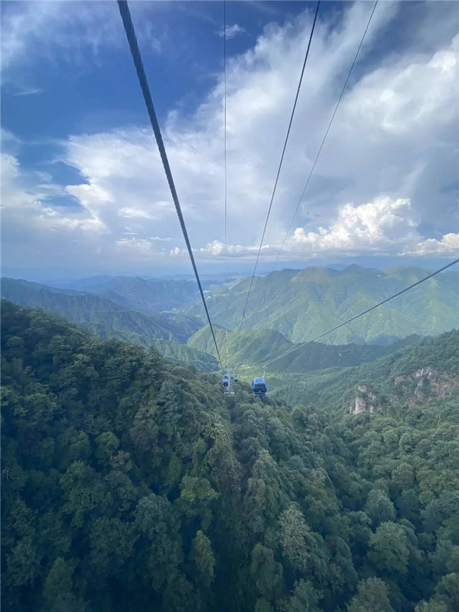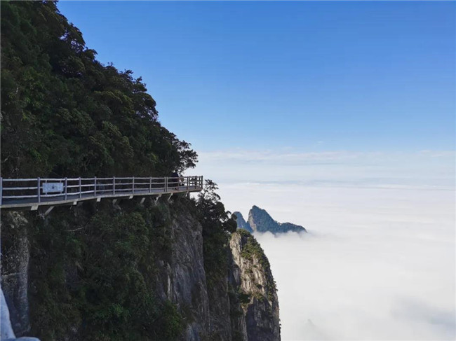 東進(jìn)西出:索道五指峰站→乘坐索道→索道天臺寺站→棧道中線→峽谷餐廳→摩天嶺電梯→棧道上線→小天臺→天臺寺→萬壽塔→天臺山停車場