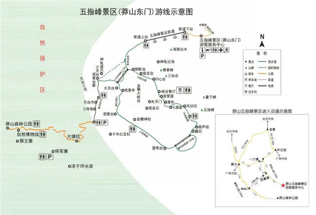 南下:出發(fā)地—京港澳高速—坪石西出口—107國道—洞仰旅游公路—莽山五指峰景區(qū)(莽山東門);